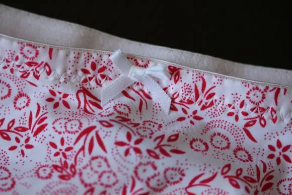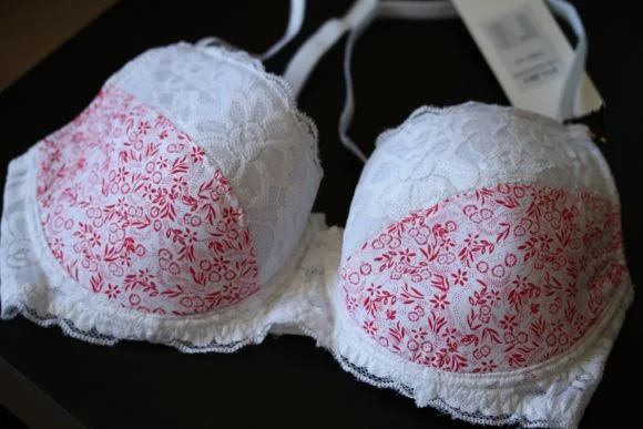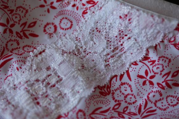 The Eve bra and brief are both made of nylon and elastane for a silky smooth feel and fit. The white lace detailing plays well with the red floral pattern, further enhancing the girlish sentiment of the garments. The stitching is of the highest quality, which leads me to believe this underwear is built to wear, wash and last.
