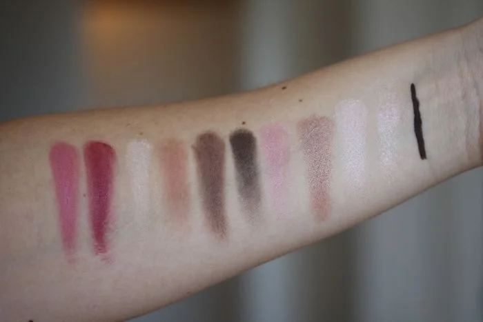 eyeshadow swatches continued (from left to right): Pink Chiffon, Brown Sugar, Pink Quartz, Ballet Pink & Chocolate (eye pencil)