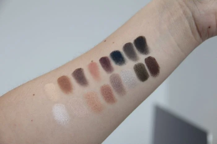 Pro Palette swatches from left to right starting on the top row: Nude, Champagne, Gold, Light Bronze, Pewter, Garnet, Deep Purple and Slate